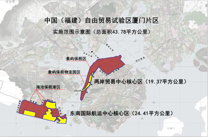 • ?????中國(guó)(福建)自由貿(mào)易試驗(yàn)區(qū)廈門(mén)片區(qū)總面積43.78平方公里。包括兩個(gè)區(qū)塊:兩岸貿(mào)易中心核心區(qū)19.37平方公里;東南國(guó)際航運(yùn)中心海滄港區(qū)24.41平方公里。